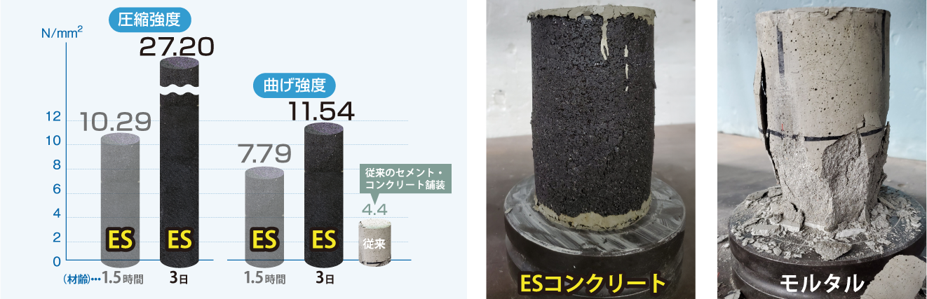 独自材料のES コンクリートは非常に高い強度を誇り。立ち上がり強度も高いので早期交通開放を可能にし、滑り抵抗値も大きいため、交通安全の面でも非常に優秀。