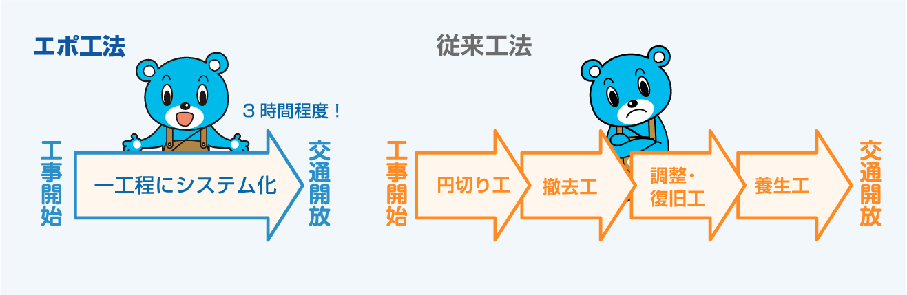 従来工法の1/4行程という施工のスリム化により、約3時間での交通開放が可能。